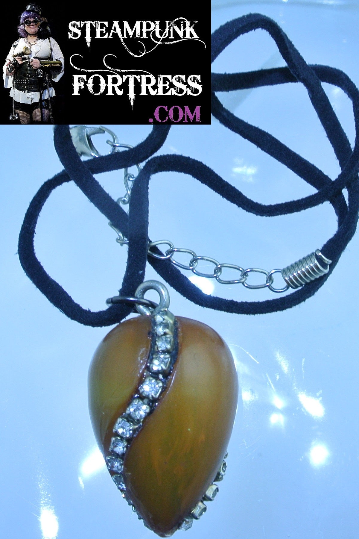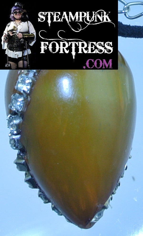 THIS IS A FABULOUS HANDMADE CUSTOM MADE STEAMPUNK DIESELPUNK CYBERPUNK NECKLACE….BLACK.... BUTTERSCOTCH BAKELITE DROP WITH RHINESTONE INLAID.....#5719