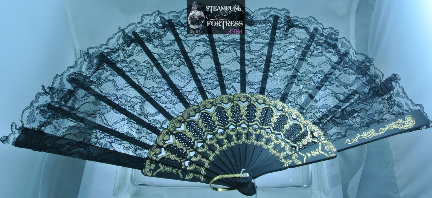 This is a fabulous steampunk dieselpunk medieval renaissance victorian edwardian cosplay costume halloween mardi gras handheld hand held prop…..Mass produced(we do not make it).....black gold lace fan....#4361
