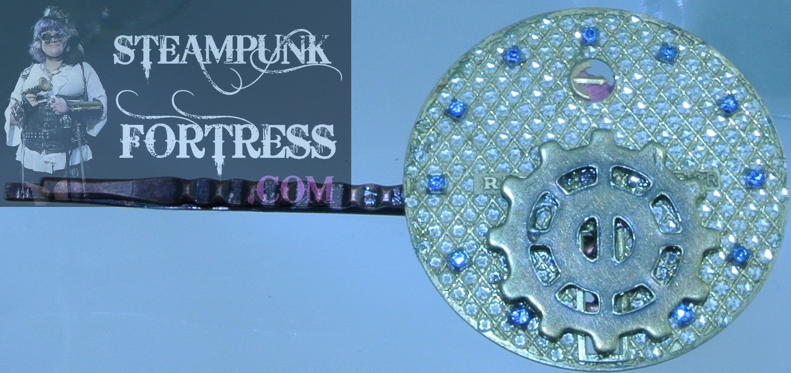 THIS IS A FABULOUS HANDMADE CUSTOM MADE STEAMPUNK DIESELPUNK CYBERPUNK HAIR ACCESSORY... ...COPPER BOBBY PIN....GOLD SILVER BLUE RADO WATCH CLOCK FACE DIAL AND BRASS GEAR ON IT...#2585