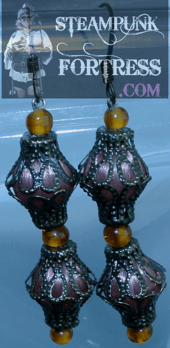 THIS IS A FABULOUS HANDMADE CUSTOM MADE STEAMPUNK DIESELPUNK CYBERPUNK, MEDIEVAL, RENAISSANCE, VICTORIAN, RENAISSANCE, EDWARDIAN, COSPLAY COSTUME COMIC CON….PIERCED EARRINGS......BRASS.....2 LIGHT BROWN ROUND NYLON BEADS 4 BEAD BASKET CAPS 3 AMBER SEED BEADS ON EACH HOOK...#5570