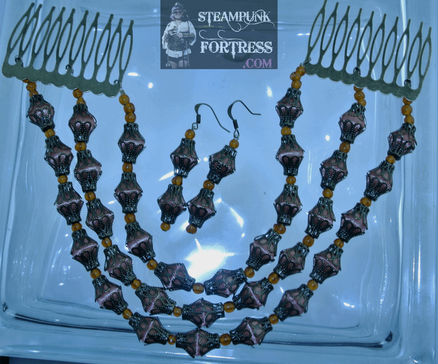 BRASS BROWN LIGHT NYLON ROUND BEADS BRASS BEAD BASKET CAPS AMBER SEED BEADS PIERCED EARRINGS VICTORIAN EDWARDIAN WEDDING SET AVAILABLE STARR WILDE STEAMPUNK FORTRESS