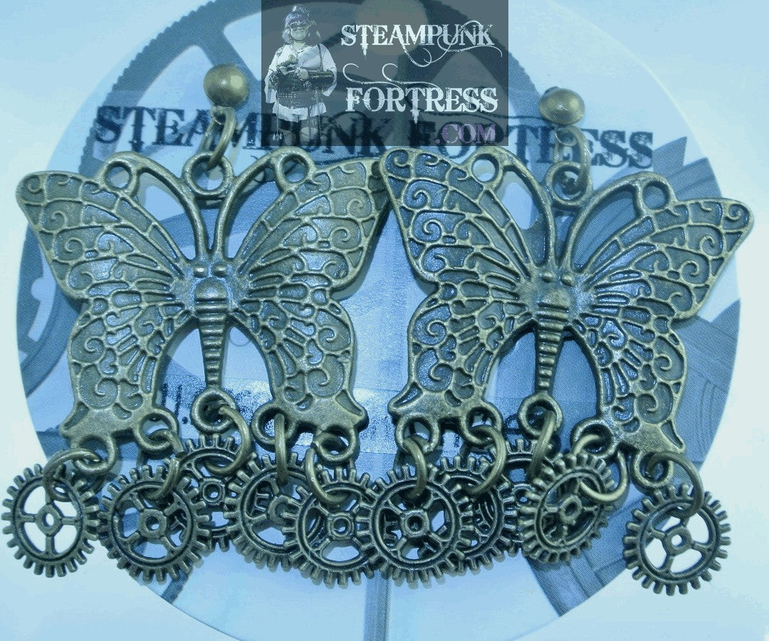 BRASS BUTTERFLY OXIDIZED 5 4 ARM GEARS STUDS WATCH CLOCK PIERCED EARRINGS SET AVAILABLE STARR WILDE STEAMPUNK FORTRESS