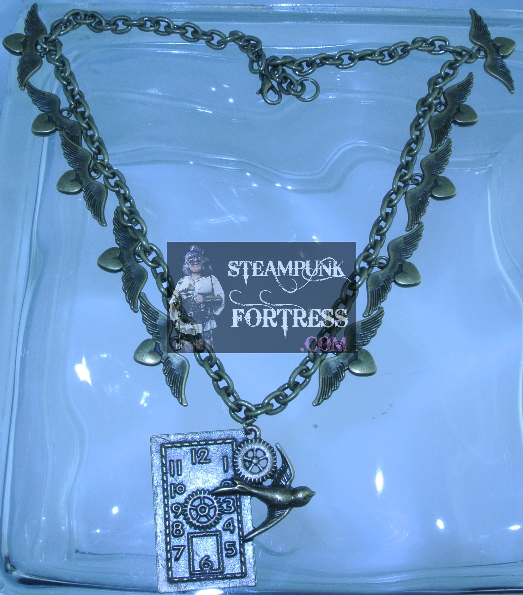 BRASS FACE RECTANGLE BIRD FLYING GEARS HEARTS WITH WINGS NECKLACE SET AVAILABLE STARR WILDE STEAMPUNK FORTRESS