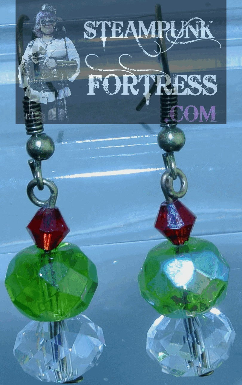 BRASS RED GREEN CLEAR SWAROVSKI CRYSTALS PIERCED EARRINGS CHRISTMAS STARR WILDE STEAMPUNK FORTRESS