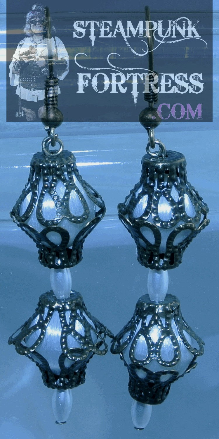 THIS IS A FABULOUS HANDMADE CUSTOM MADE STEAMPUNK DIESELPUNK CYBERPUNK, MEDIEVAL, RENAISSANCE, VICTORIAN, RENAISSANCE, EDWARDIAN, COSPLAY, COSTUME, SDCC, COMIC CON…..PIERCED EARRINGS......BRASS.....2 WHITE ROUND NYLON BEADS 4 BEAD BASKET CAPS 2 OVAL PEARLS ON EACH HOOK...#2887