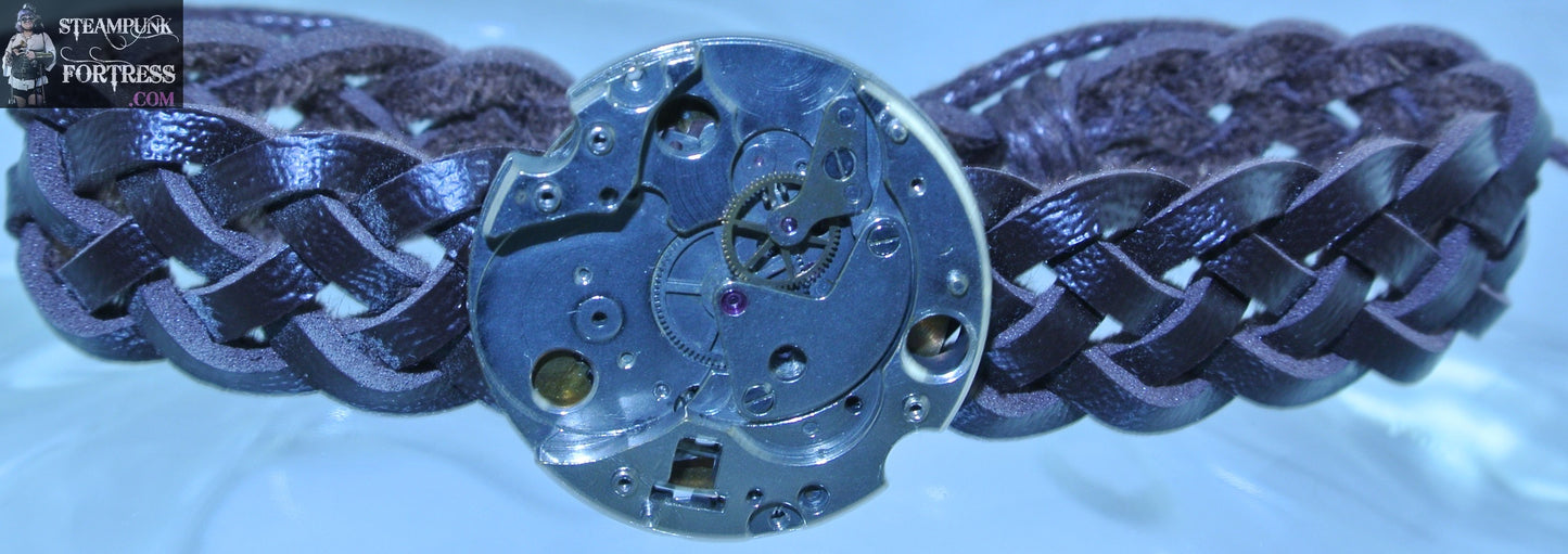BROWN FAUX LEATHER BRAIDED BRACELET SILVER AUTHENTIC WATCH CLOCK PARTIAL ROUND MOVEMENT STARR WILDE STEAMPUNK FORTRESS