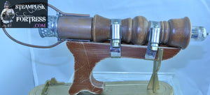 THIS IS A FABULOUS HANDMADE STEAMPUNK RAY GUN CANNON......BROWN WOOD HANDLE WITH ROCKET FRONT FLARE BACK WITH SILVER CLAMPS...WEIGHS IN AT 8.6 OUNCES......#1110
