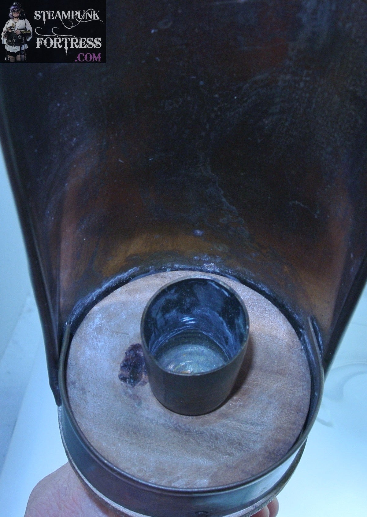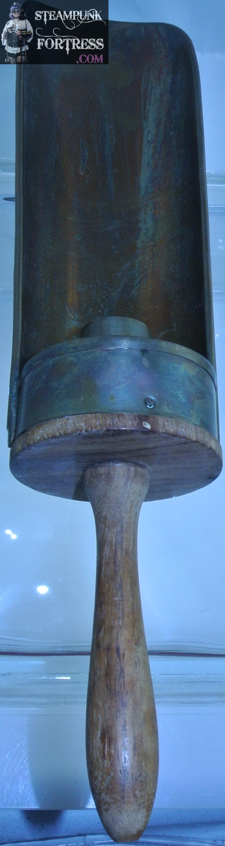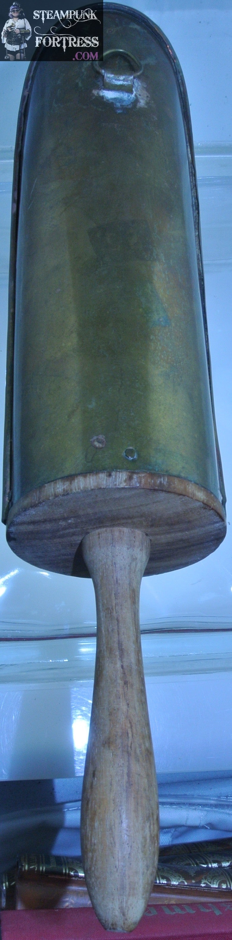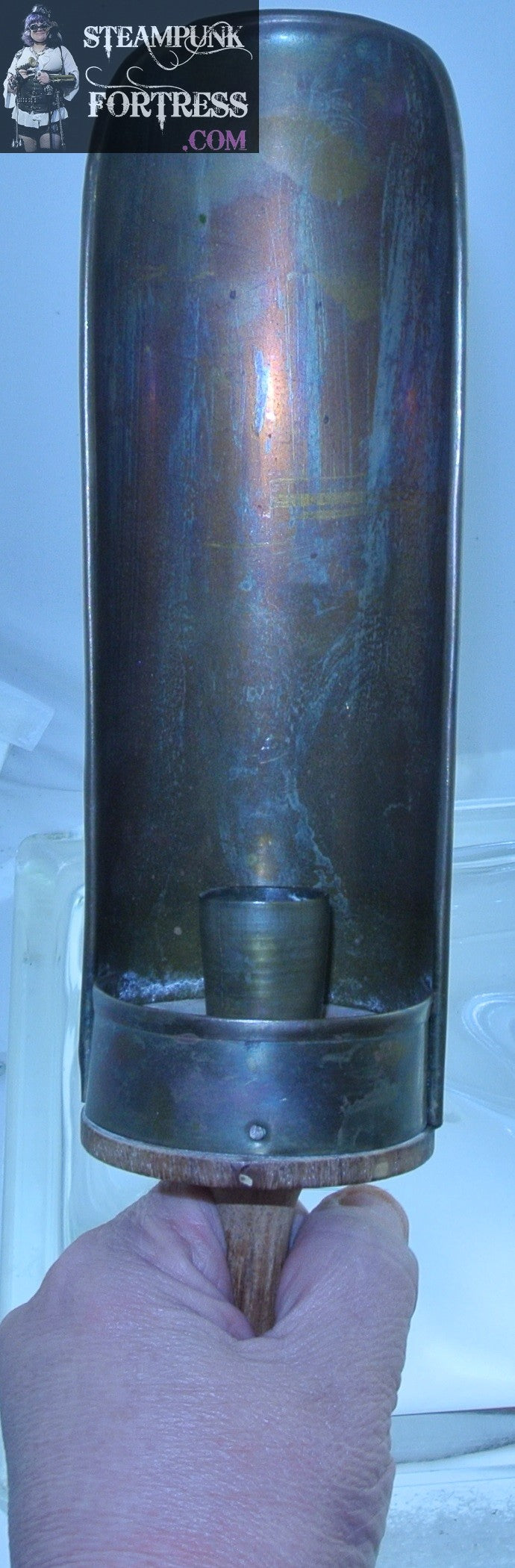THIS IS A VINTAGE WOOD AND BRASS CANDLE HOLDER...HAS A ROUNDED HANDLE TO HOLD AND SOMEONE SOLDERED A HANGER ON BACK...BASED ON NAILS I AM THINKING MID 19TH CENTURY?? DEFINITELY NOT AN EXPERT. (GREEN CANDLE NOT INCLUDED)....#7577
