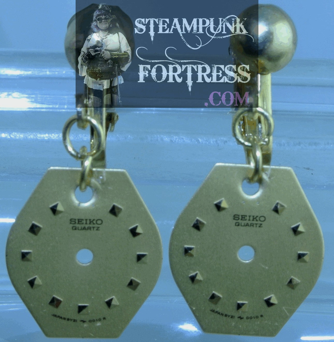 CLIPS GOLD CLOCK FACE WATCH DIAL SEIKO CLIP ON EARRINGS STARR WILDE STEAMPUNK FORTRESS