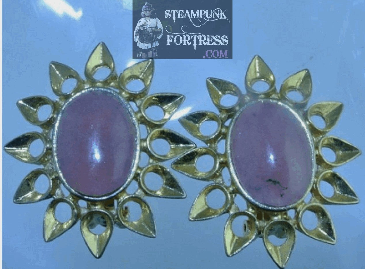 THIS IS A FABULOUS HANDMADE CUSTOM MADE STEAMPUNK DIESELPUNK CYBERPUNK, MEDIEVAL, RENAISSANCE, VICTORIAN, RENAISSANCE, EDWARDIAN, COSPLAY, COSTUME, SDCC, COMIC CON….CLIPS EARRINGS.....GOLD TONE.....PINK JADE GEMSTONES SUNBURST.....#5973