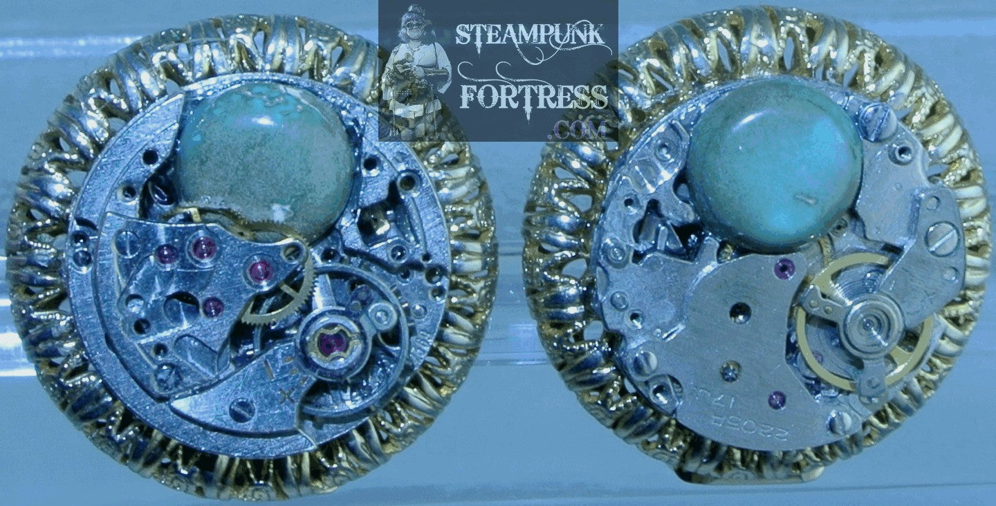 CLIPS GOLD SILVER MOVEMENT COMPLETE AUTHENTIC GENUINE WATCH CLOCK SIGNED ALICE CAVINESS FILIGREE EDGE TURQUOISE GEMSTONES CLIP ON EARRINGS STARR WILDE STEAMPUNK FORTRESS