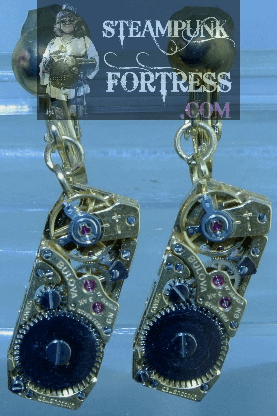 CLIPS GOLD MOVEMENT COMPLETE BULOVA RECTANGLE AUTHENTIC GENUINE WATCH CLOCK CLIP ON EARRINGS STARR WILDE STEAMPUNK FORTRESS