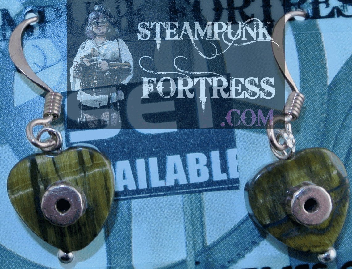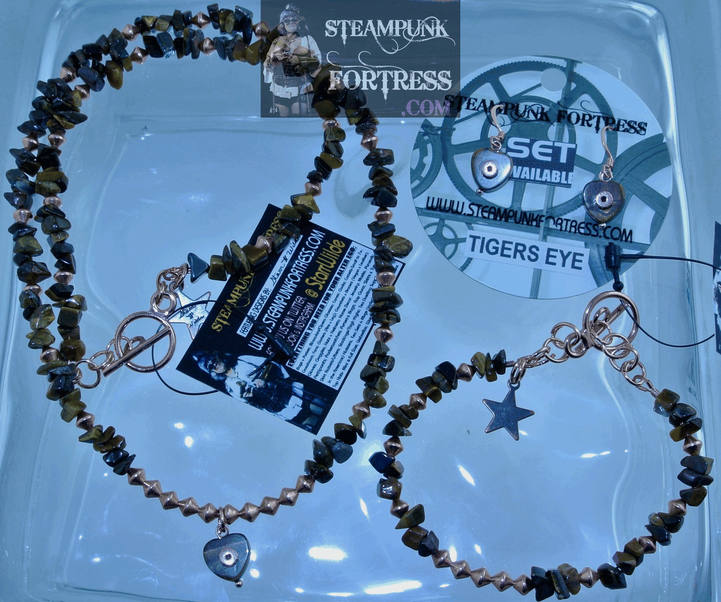 COPPER BRIGHT TIGERS EYE GEMSTONE HEARTS GEAR PIERCED EARRINGS SET AVAILABLE STARR WILDE STEAMPUNK FORTRESS