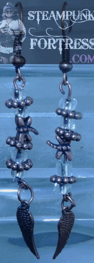THIS IS A FABULOUS HANDMADE CUSTOM MADE STEAMPUNK DIESELPUNK CYBERPUNK, MEDIEVAL, RENAISSANCE, VICTORIAN, RENAISSANCE, EDWARDIAN, COSPLAY, COSTUME, SDCC, COMIC CON…..PIERCED EARRINGS....COPPER....1 DRAGONFLY AND 3 SPACERS AND 4 CLEAR BEADS AND 1 TINY WING ON EACH HOOK.......#5073