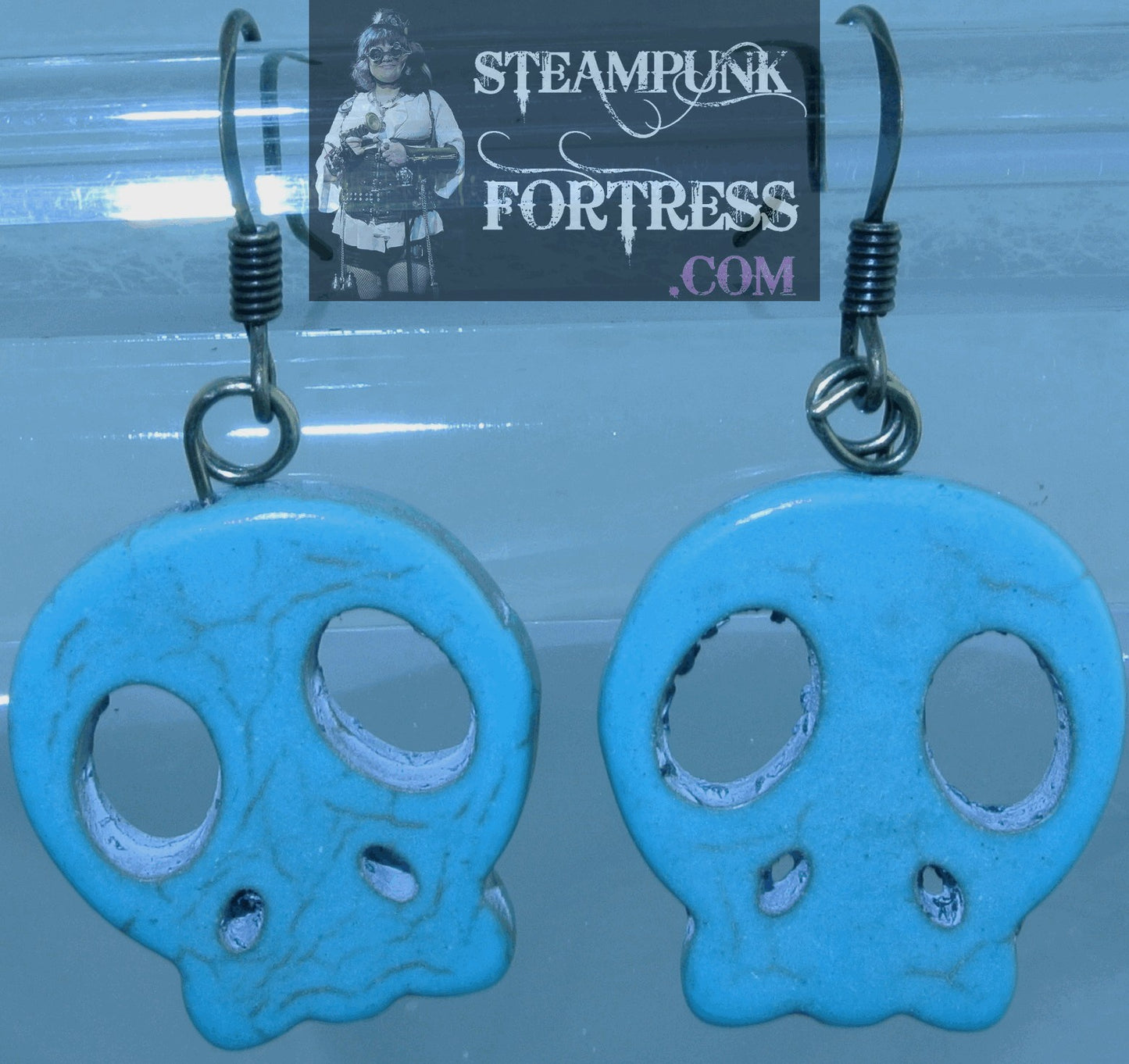 THIS IS A FABULOUS HANDMADE CUSTOM MADE STEAMPUNK DIESELPUNK CYBERPUNK, MEDIEVAL, RENAISSANCE, VICTORIAN, EDWARDIAN, COSPLAY COSTUME COMIC CON….PIERCED EARRINGS......BRASS....1 TURQUOISE SKULL FACE FLAT 3D HOWLITE GEMSTONE ON EACH HOOK....#5996