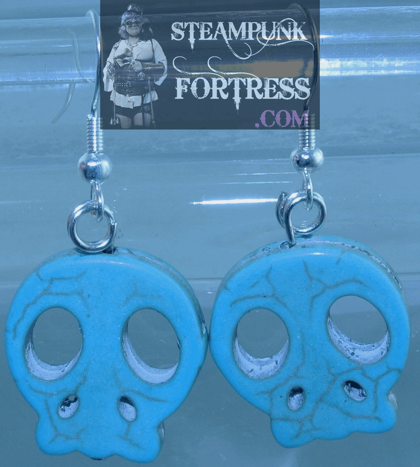 THIS IS A FABULOUS HANDMADE CUSTOM MADE STEAMPUNK DIESELPUNK CYBERPUNK, MEDIEVAL, RENAISSANCE, VICTORIAN, EDWARDIAN, COSPLAY COSTUME COMIC CON….PIERCED EARRINGS......SILVER TONE....1 TURQUOISE SKULL FACE FLAT 3D HOWLITE GEMSTONE ON EACH HOOK....#5453