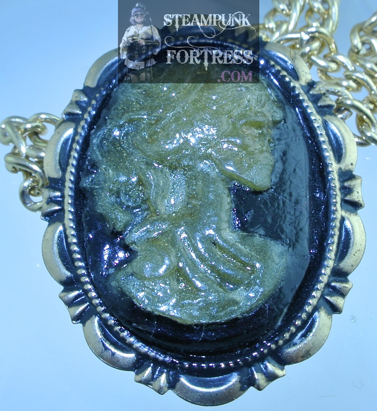THIS IS A FABULOUS HANDMADE CUSTOM MADE STEAMPUNK DIESELPUNK CYBERPUNK NECKLACE.... GOLD…..GOLD TONE NECKLACE THAT IS ALSO A PIN/BROOCH..IT IS A GLOW IN THE DARK SKELETON LADY CAMEO..#5530