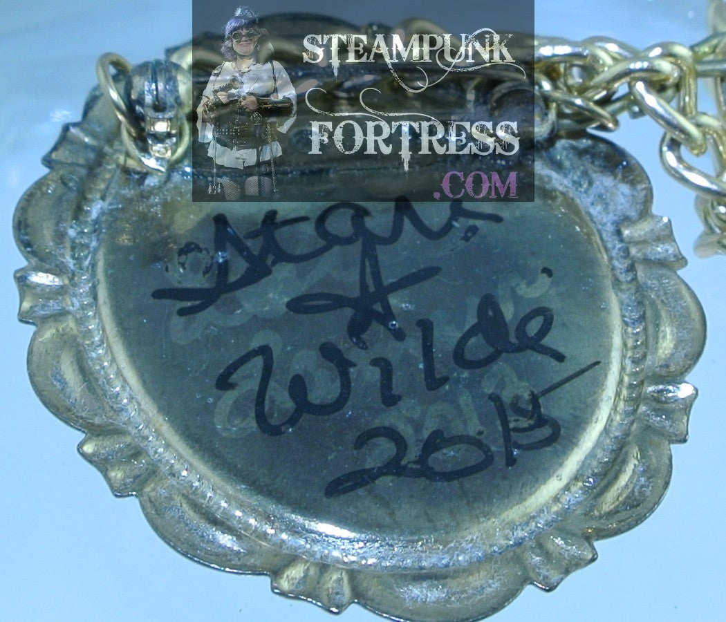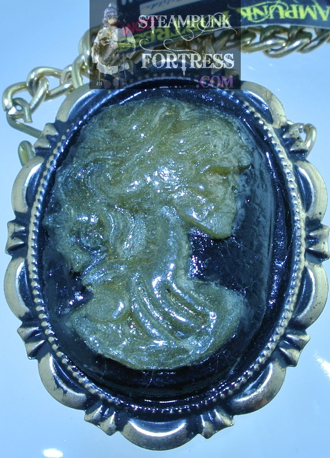 PIN BROOCH GLOW IN THE DARK GOLD CAMEO SKELETON LADY LIGHTER NECKLACE STARR WILDE STEAMPUNK FORTRESS HALLOWEEN COSPLAY COSTUME