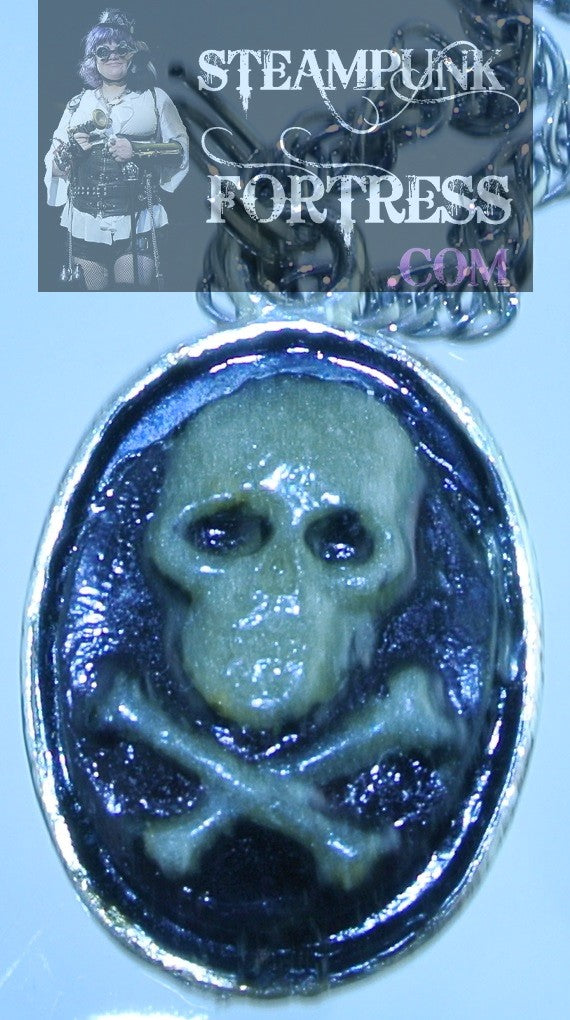 GLOW IN THE DARK SILVER SKULL BLACK CROSSBONES NECKLACE HALLOWEEN PIRATE STARR WILDE STEAMPUNK FORTRESS