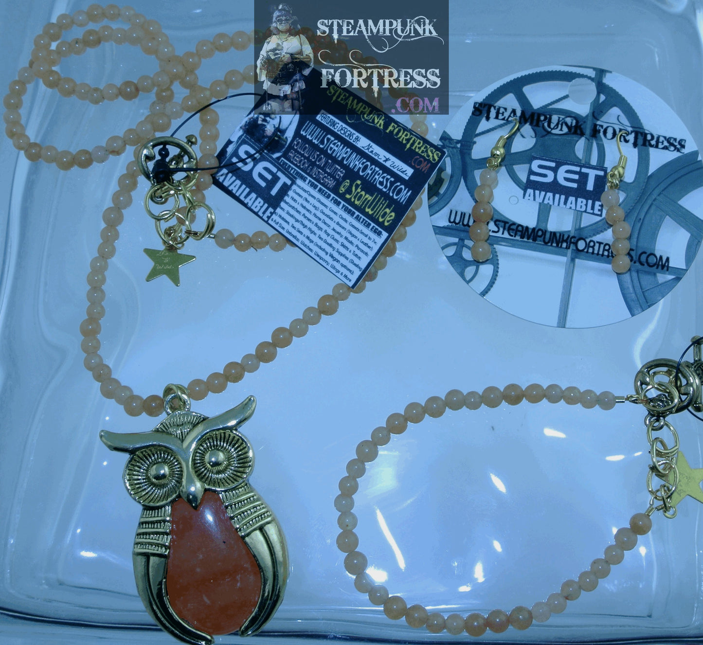 Bags & Purses; Barrettes & Hair combs, Hair Tiaras; Binoculars/Opera Glasses; BTS merchandise- Photocards, custom jewelry etc; Canes- including telescope canes and ones that break down; Clocks; Crossbows-Wrist Gauntlets; Fans; Garters-Arm & Leg for Men and Women; Gauntlets & Bracers (including Vegan options); Gloves; Goggles & Glasses; Hats & Helmets; Home Decor- including Christmas Ornaments & Wreaths; Jewelry- Bracelets, Cufflinks, Earrings- Clips & Pierced, Necklaces, Pins/Brooches, Rings, Tie Tacks & More; Masks; Parasols; Pocketwatches; Purses; Ray Guns; Skirt Lifters; Stockings/Thigh Highs; Tea Dueling Supplies (including Vegan options); Top Hats- Mini & Full; Umbrellas; Vintage Ladies Jewelry Collection- Performers from the Belle Epoque photos into jewelry; Watches; Weaponry-Knives & Swords (Real and Replica); Wings and More. Starr can also repair your precious jewelry, restring pearls, change pierced earrings to clip earrings or clip earrings to pierced earrings. She can also work with you to design a custom piece of jewelry or hat, or weapons etc. She can also customize any piece we have in stock such as adding a veil to a hat, etc. Call or e-mail to make an appointment. Visit our store: Steampunk Fortress.