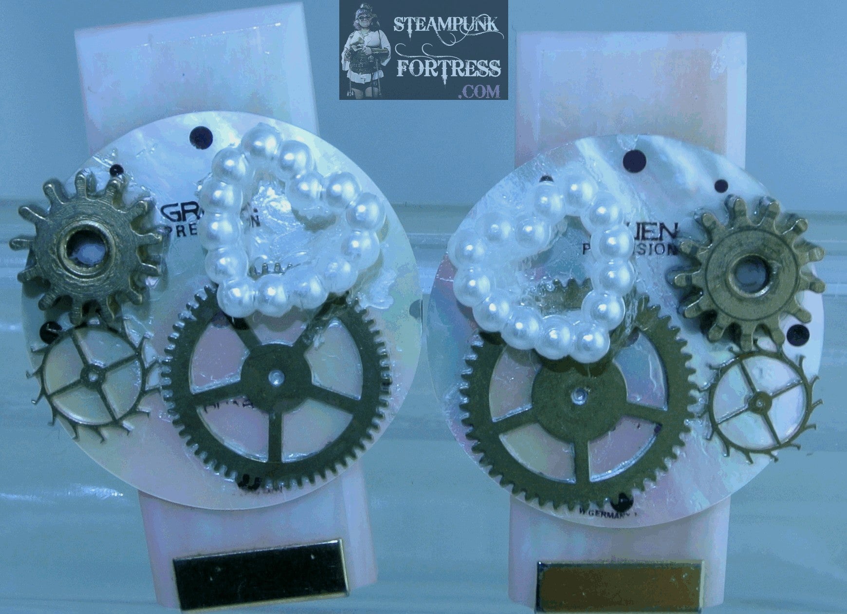 GOLD PINK ABALONE GRUEN FACE DIAL WATCH CLOCK AUTHENTIC GENUINE GEAR PEARL GEMSTONES HEART PIERCED EARRINGS STARR WILDE STEAMPUNK FORTRESS