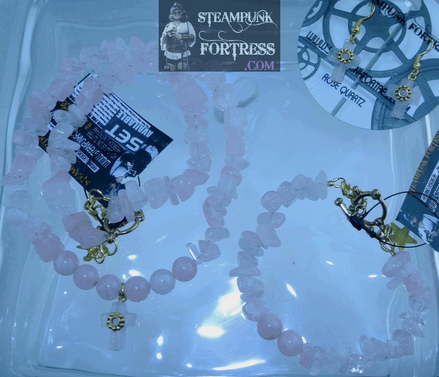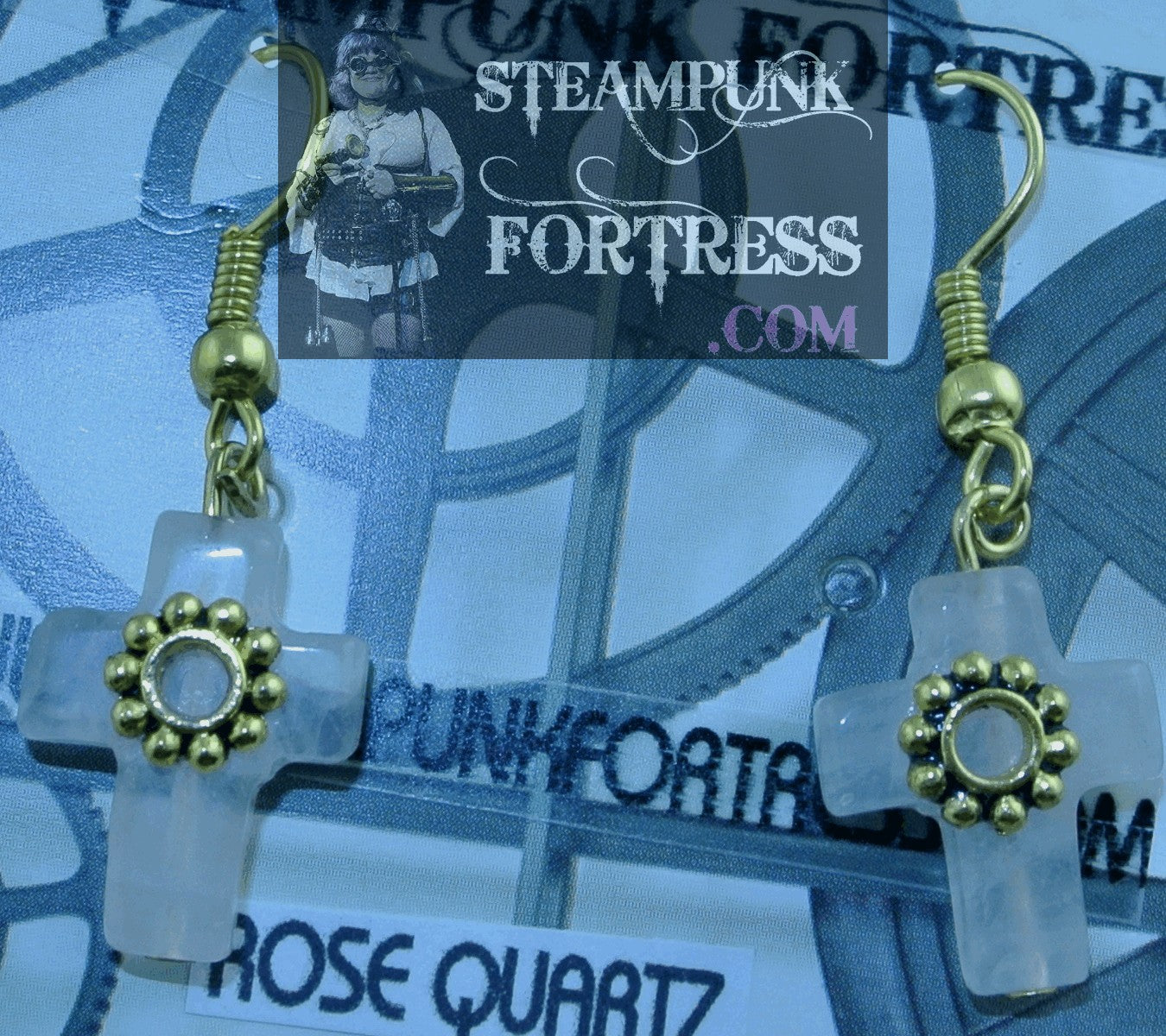 THIS IS A FABULOUS HANDMADE CUSTOM MADE STEAMPUNK DIESELPUNK CYBERPUNK, MEDIEVAL, RENAISSANCE, VICTORIAN, RENAISSANCE, EDWARDIAN, COSPLAY COSTUME COMIC CON….HANDMADE STEAMPUNK PIERCED EARRINGS....GOLD TONE...1 ROSE QUARTZ CROSS WITH GOLD GEAR ON EACH HOOK.......#6187
