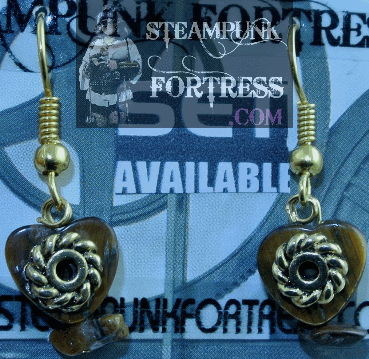 GOLD TIGERS EYE GEMSTONES STONES HEARTS GOLD GEAR DOG BONES PIERCED EARRINGS SET AVAILABLE STARR WILDE STEAMPUNK FORTRESS