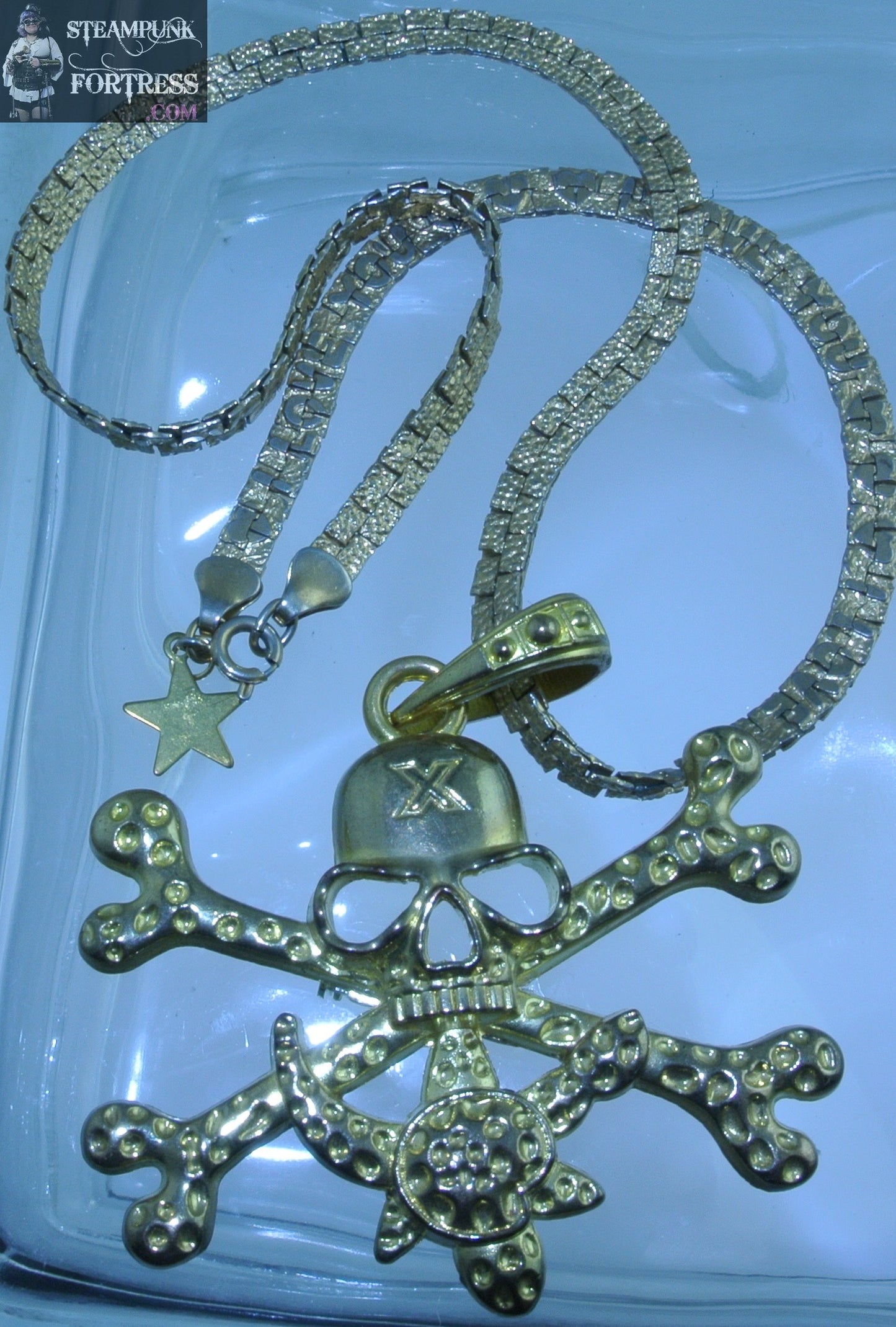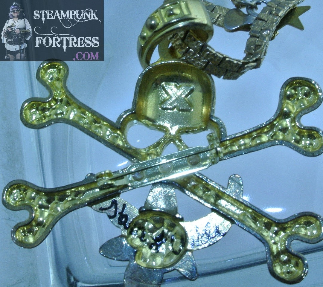 GOLD VINTAGE XL SKULL CROSSBONES PIN BROOCH NECKLACE PIRATE STARR WILDE STEAMPUNK FORTRESS