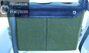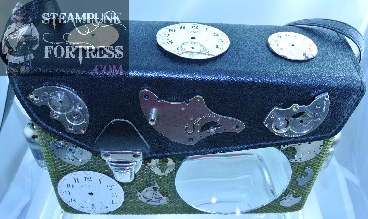 GREEN FABRIC BLACK TRIM PORCELAIN DIAL WATCH CLOCK FACE EMPTY MOVEMENTS VINTAGE TOP MIRROR FRONT ROCKET SIDES PURSE STARR WILDE STEAMPUNK FORTRESS