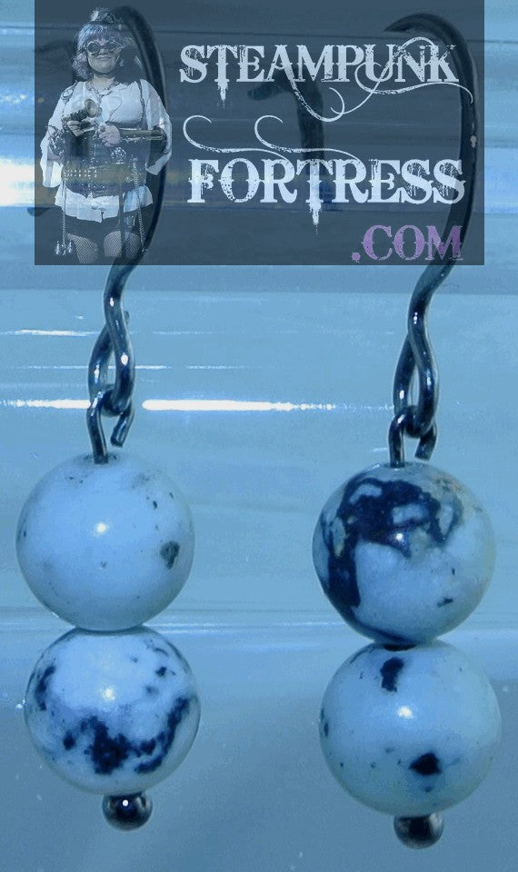 THIS IS A FABULOUS HANDMADE CUSTOM MADE STEAMPUNK DIESELPUNK CYBERPUNK, MEDIEVAL, RENAISSANCE, VICTORIAN, RENAISSANCE, EDWARDIAN, COSPLAY COSTUME COMIC CON…. PIERCED EARRINGS...GUNMETAL....2 APACHE JASPER GEMSTONE ROUNDS ON EACH HOOK....#1516