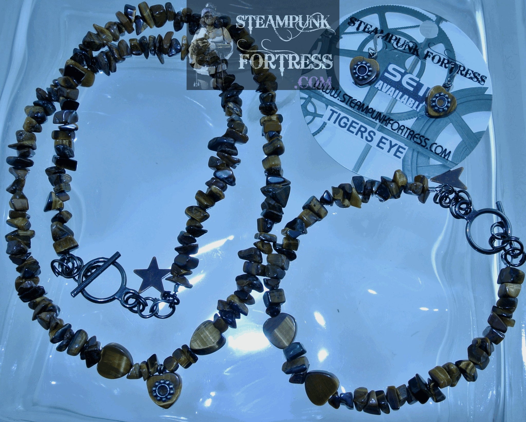 GUNMETAL TIGERS EYE GEMSTONE HEART GEAR PIERCED EARRINGS SET AVAILABLE STARR WILDE STEAMPUNK FORTRESS
