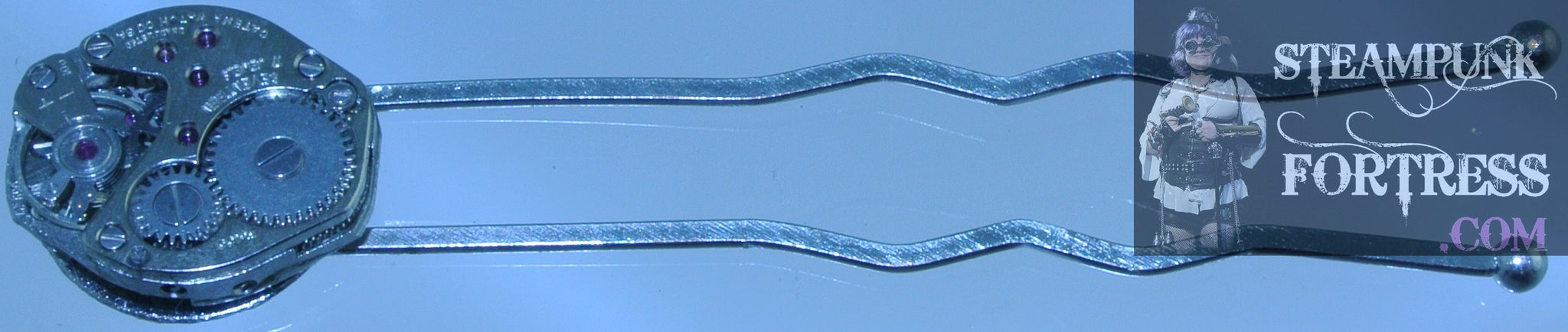 THIS IS A FABULOUS HANDMADE CUSTOM MADE STEAMPUNK DIESELPUNK CYBERPUNK, MEDIEVAL, RENAISSANCE, VICTORIAN, RENAISSANCE, EDWARDIAN, COSPLAY COSTUME COMIC CON HAIR ACCESSORY….SILVER HAIR PICK...GENUINE CATENA 17 JEWEL OVAL WATCH MOVEMENT....#4655