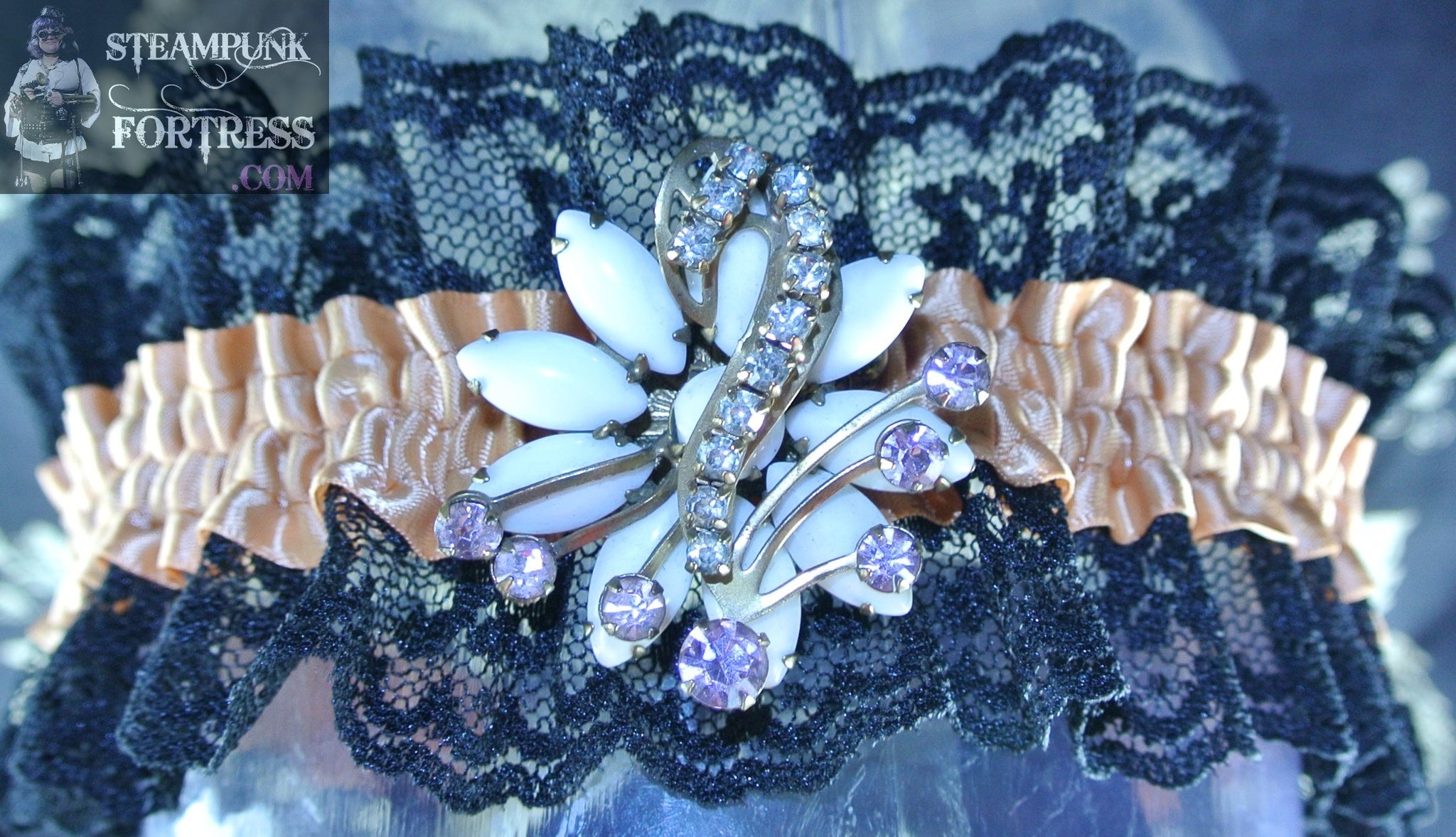 THIS IS A FABULOUS HANDMADE CUSTOM MADE STEAMPUNK DIESELPUNK CYBERPUNK, MEDIEVAL, RENAISSANCE, VICTORIAN, RENAISSANCE, EDWARDIAN, COSPLAY, COSTUME, HALLOWEEN, SDCC, COMIC CON….. USE ON ARM OR LEG….GREAT FOR STEAMPUNK WEDDING….PEACH WITH BLACK LACE WITH REMOVABLE VINTAGE WHITE STONE AND PURPLE RHINESTONE FLORAL FLOWER PIN BROOCH......#3445