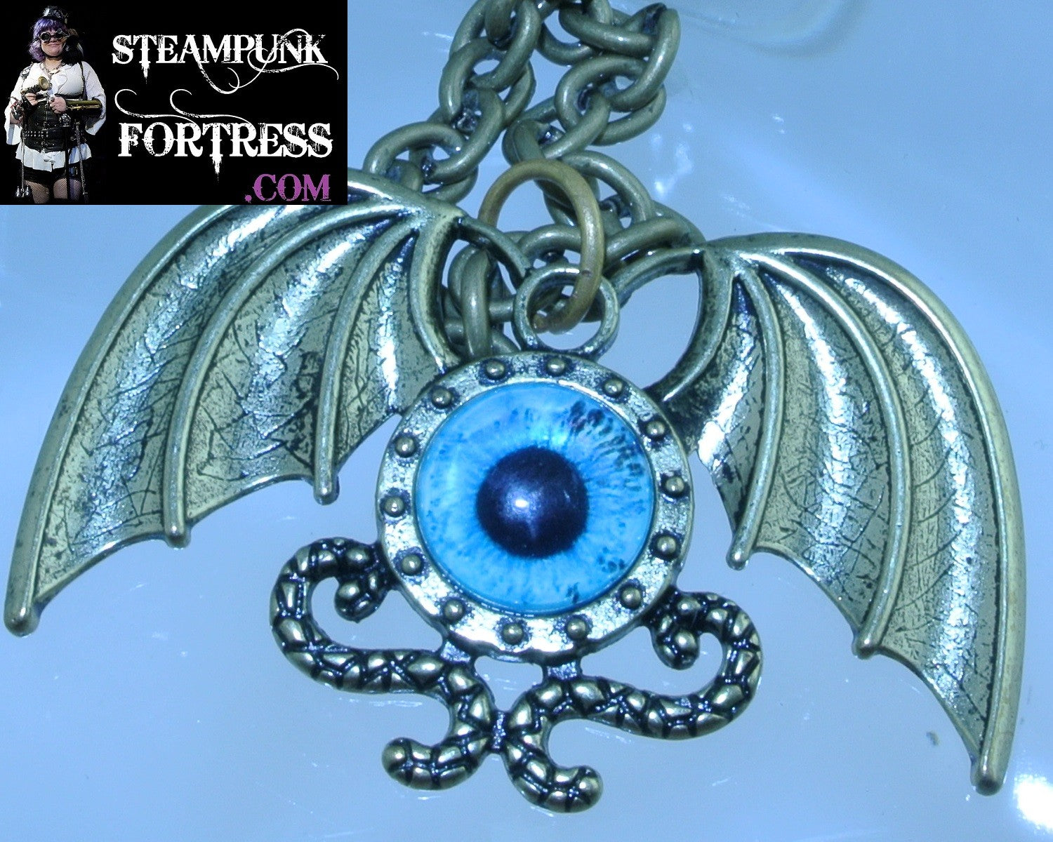 THIS IS A FABULOUS HANDMADE CUSTOM MADE STEAMPUNK DIESELPUNK CYBERPUNK NECKLACE.... BRASS…BRASS CHAIN AND BRASS WING WINGED BLUE EYE CHARM....THAT IS ALSO A PIN/BROOCH....#3831