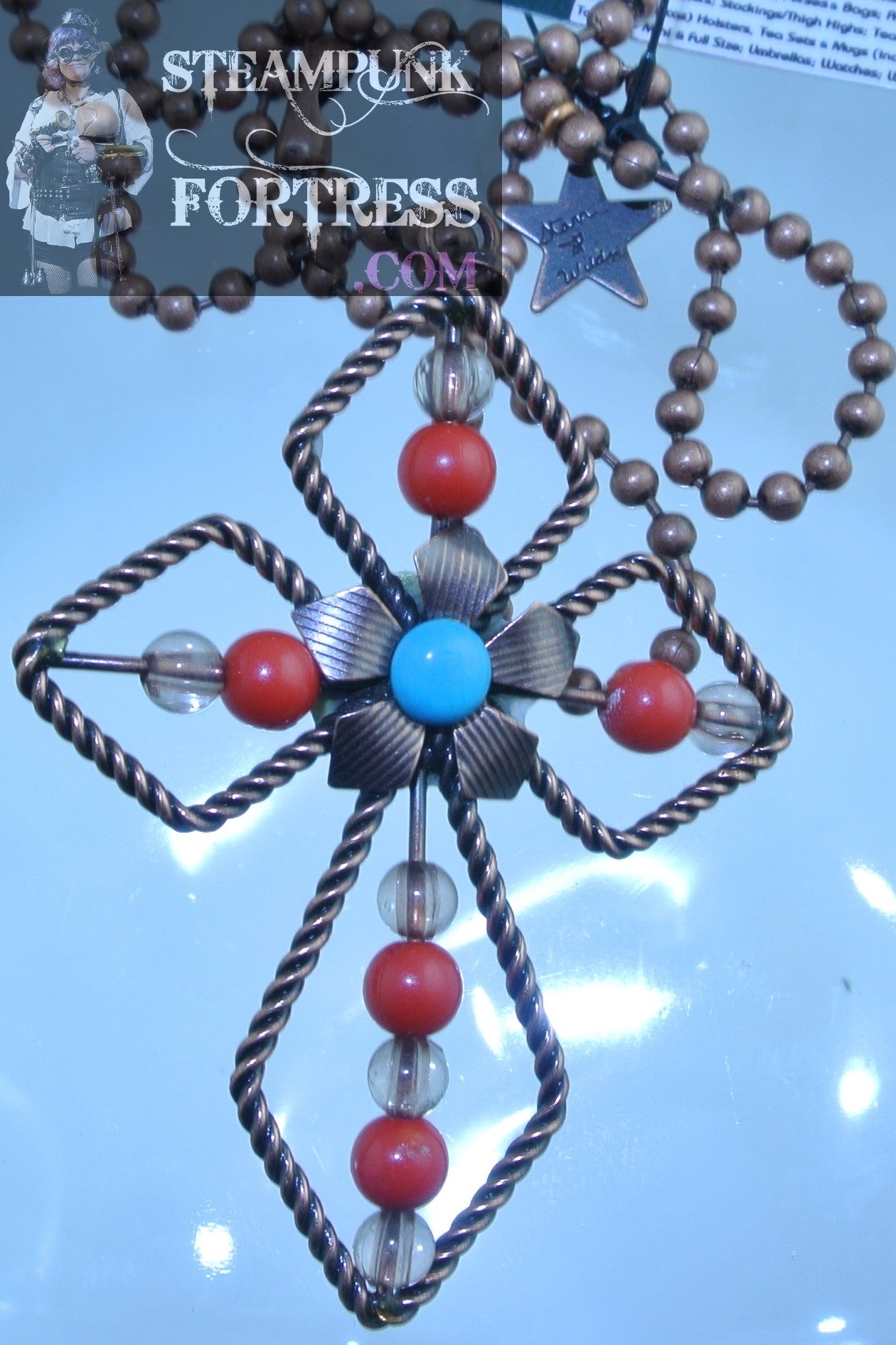 PIN BROOCH COPPER CROSS TWISTED FLOWER CENTER RED BEADS NECKLACE VERSATILE MULTI USE STARR WILDE STEAMPUNK FORTRESS