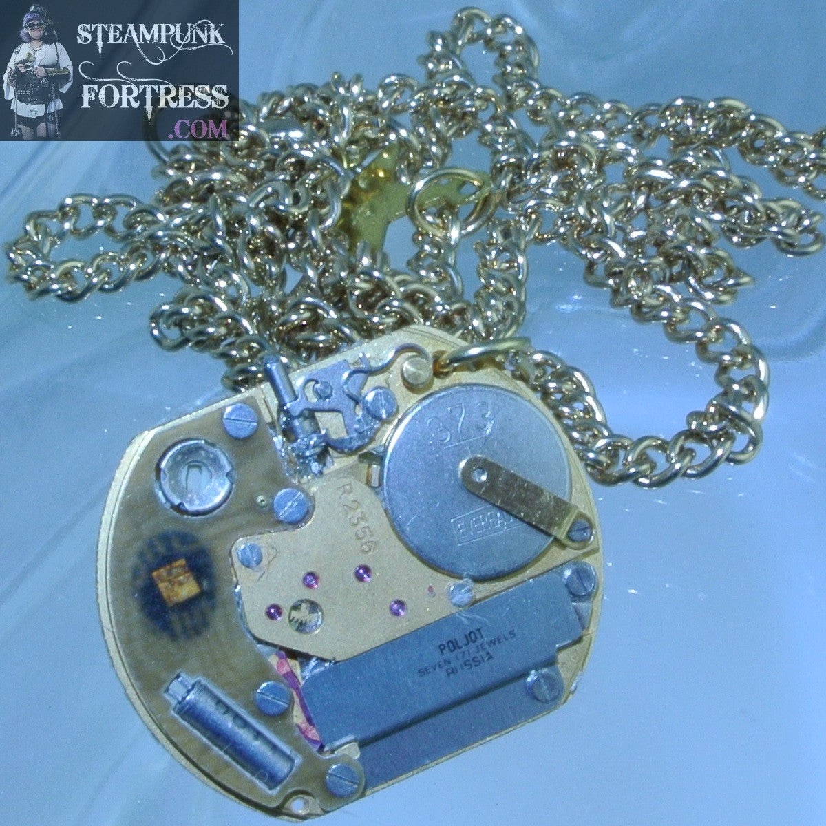 THIS IS A FABULOUS HANDMADE CUSTOM MADE STEAMPUNK DIESELPUNK CYBERPUNK PIN/BROOCH & NECKLACE.... GOLD POLJET RUSSIA COMPLETE WATCH CLOCK MOVEMENT...#3787