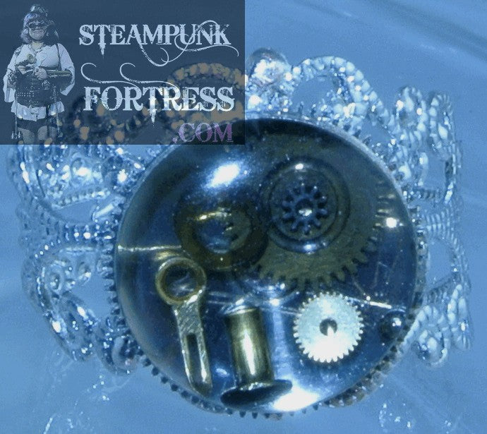 SILVER .5" GOLD GEARS FILIGREE AUTHENTIC GENUINE WATCH CLOCK CASE ADJUSTABLE RING STARR WILDE STEAMPUNK FORTRESS