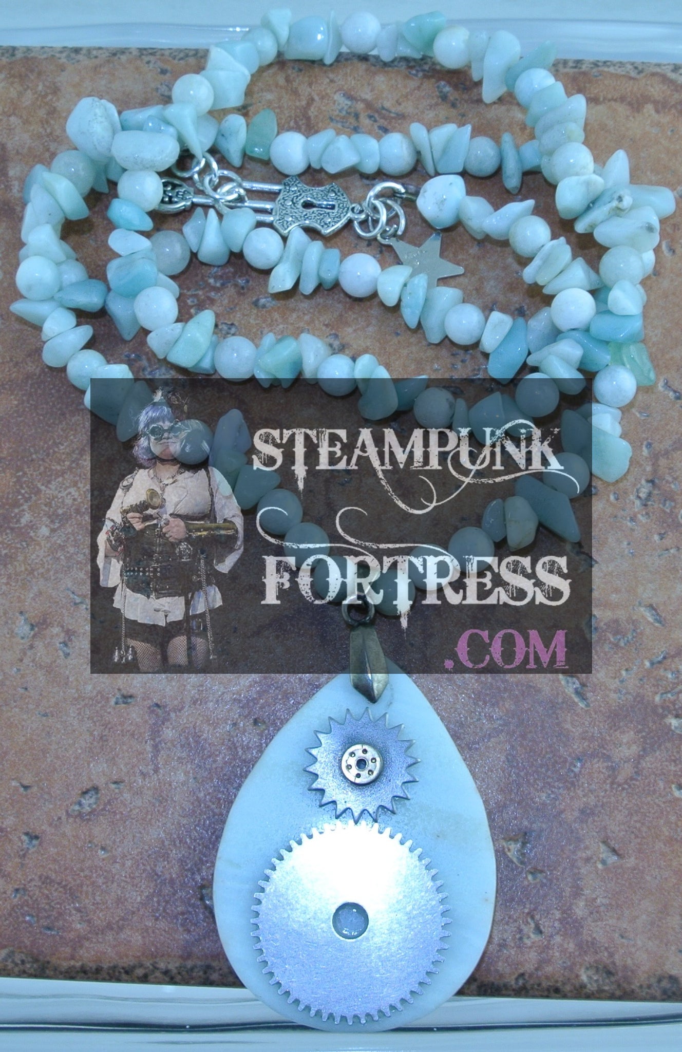 SILVER AMAZONITE GEMSTONES STONES TEARDROP FOCAL 2 SILVER GEARS BB8 ROUNDS CHIPS NECKLACE SET AVAILABLE 2 SIDED REVERSIBLE STARR WILDE STEAMPUNK FORTRESS