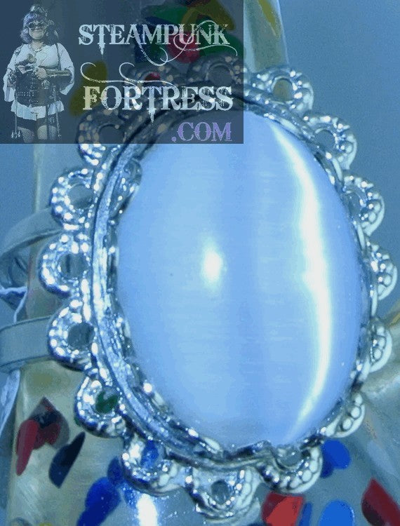 SILVER CATS EYE GEMSTONE STONES WHITE LACE EDGE 18MM X 13MM ADJUSTABLE RING STARR WILDE STEAMPUNK FORTRESSS