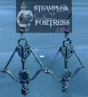 THIS IS A FABULOUS HANDMADE CUSTOM MADE STEAMPUNK DIESELPUNK CYBERPUNK, MEDIEVAL, RENAISSANCE, VICTORIAN, RENAISSANCE, EDWARDIAN, COSPLAY, COSTUME, SDCC, COMIC CON…..SILVER TONE PIERCED EARRINGS....1 CROSSBOW ON EACH HOOK..#5858....