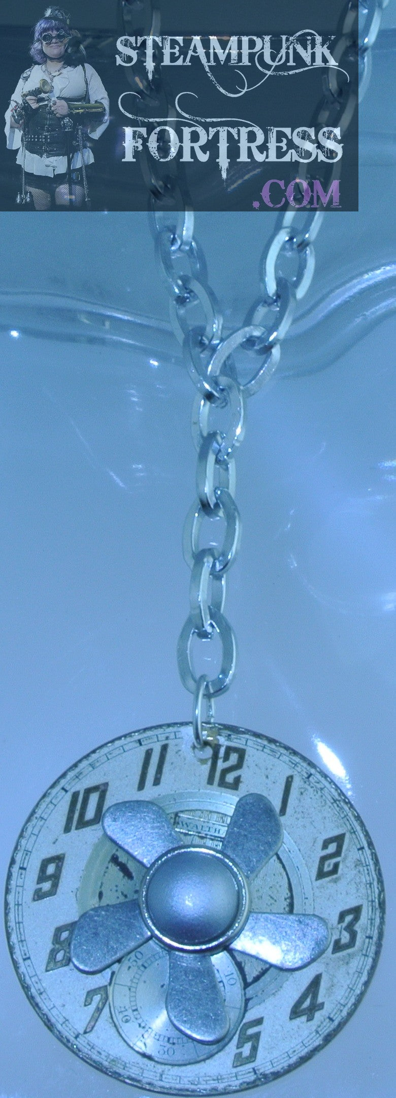THIS IS A FABULOUS HANDMADE CUSTOM MADE STEAMPUNK DIESELPUNK CYBERPUNK NECKLACE.... SILVER…..SILVER TONE CHAIN WITH WALTHAM SILVER GOLD CLOCK WATCH FACE DIAL AND PROPELLER THAT CAN SPIN AND PEARL ON IT.......#2080
