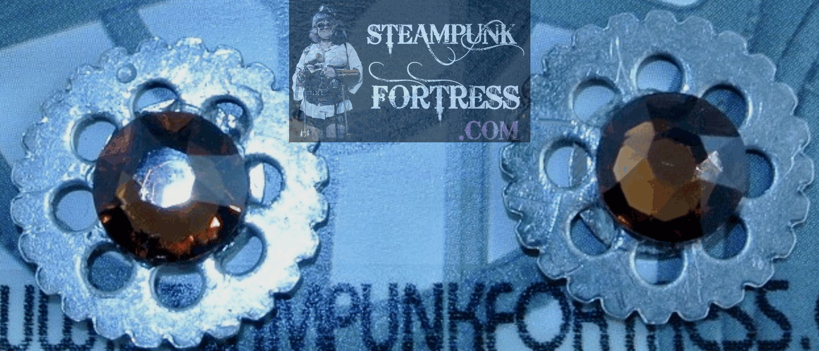 SILVER GEARS ROUND 7MM COPPER BROWN GOLD SWAROVSKI CRYSTALS STUDS PIERCED EARRINGS WATCH CLOCK STARR WILDE STEAMPUNK FORTRESS