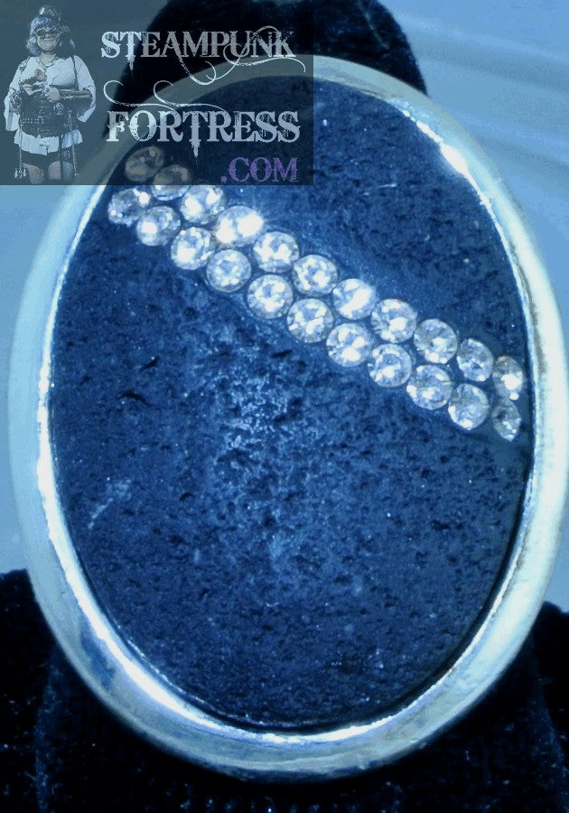 SILVER LAVA ROCK GEMSTONE CLEAR SWAROVSKI CRYSTALS 20MM X 25MM ADJUSTABLE RING STARR WILDE STEAMPUNK FORTRESS