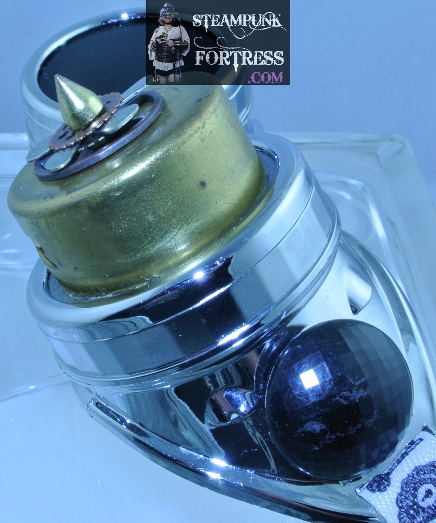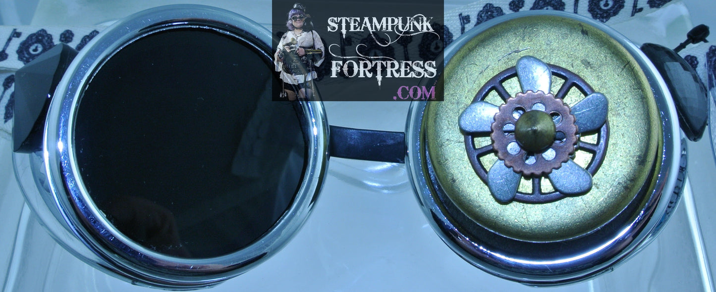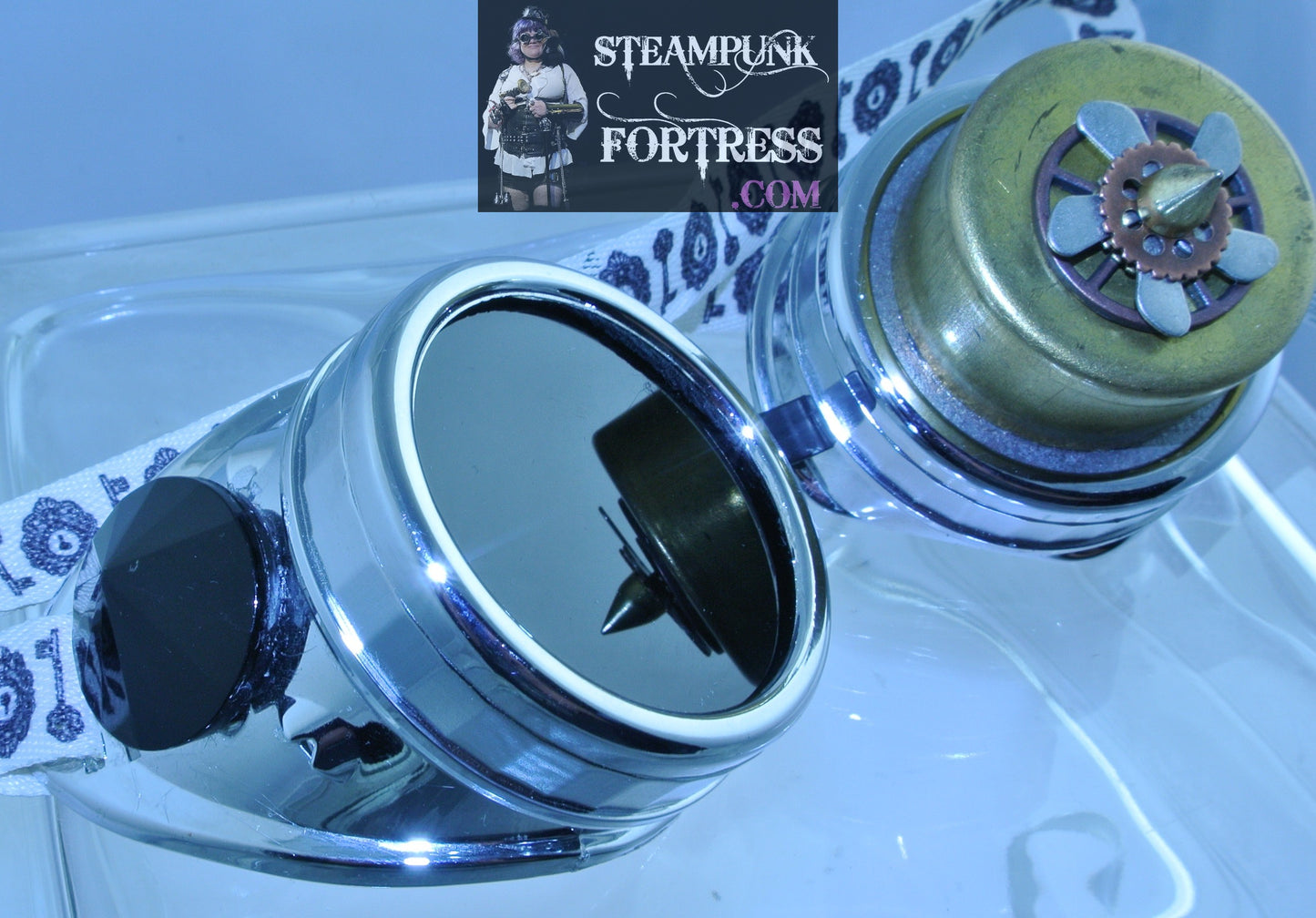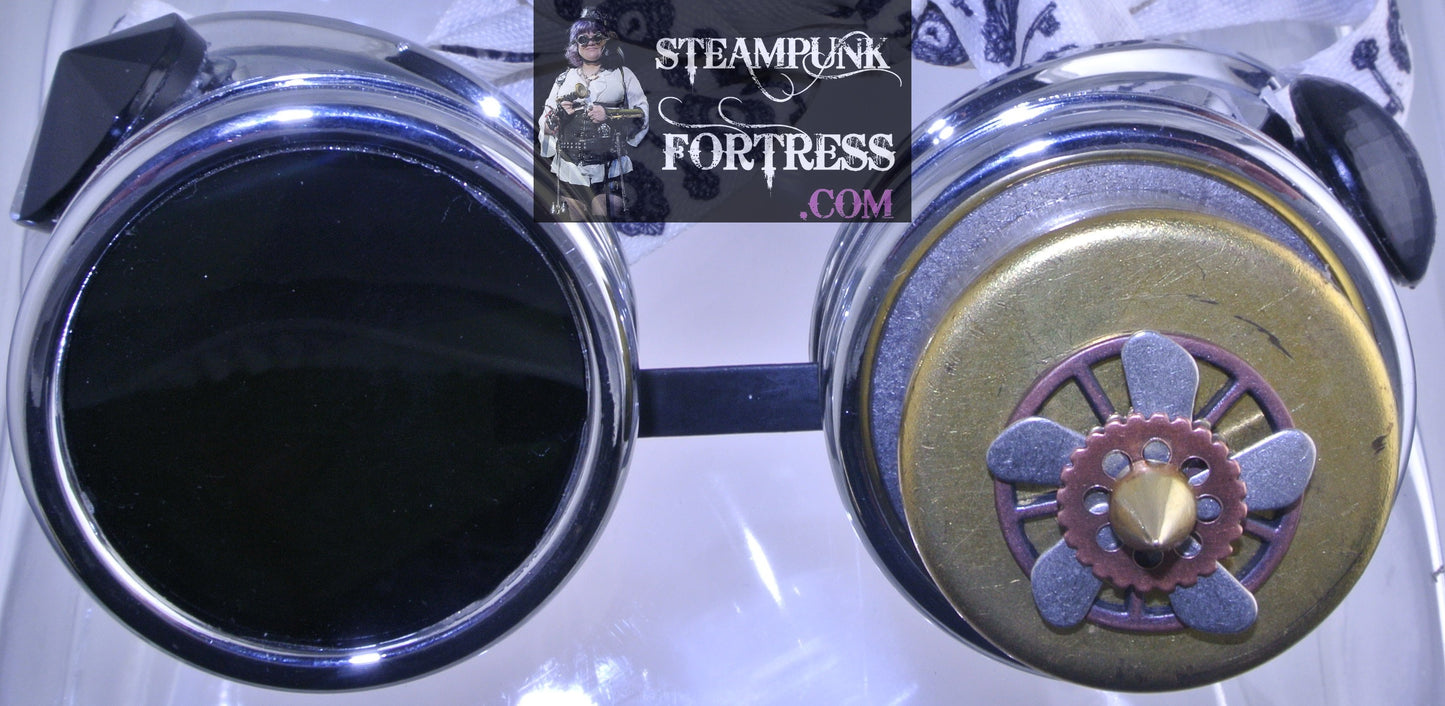 SILVER GOGGLES LEFT EYE BRASS AUTHENTIC GENUINE CUP COPPER WATCH CLOCK GEAR SILVER KINETIC SPINS SPINNING PROPELLER BLACK SIDES KEY LOCK RIBBONS STARR WILDE STEAMPUNK FORTRESS