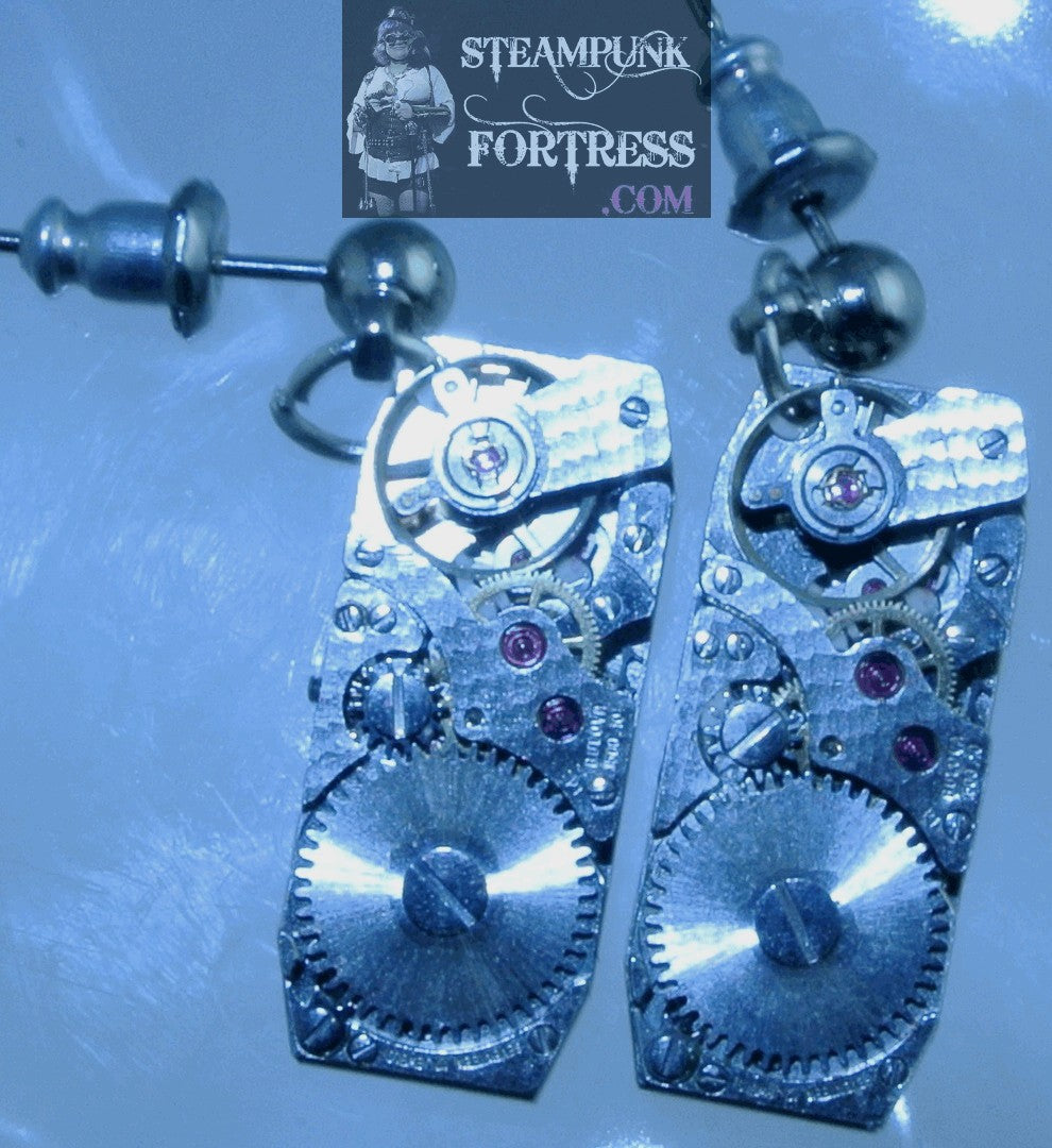 THIS IS A FABULOUS HANDMADE CUSTOM MADE STEAMPUNK DIESELPUNK CYBERPUNK, MEDIEVAL, RENAISSANCE, VICTORIAN, RENAISSANCE, EDWARDIAN, COSPLAY, COSTUME, SDCC, COMIC CON…..PIERCED EARRINGS...SILVER.....1 AUTHENTIC BULOVA RECTANGLE WATCH CLOCK MOVEMENT ON EACH STUD.........#1370