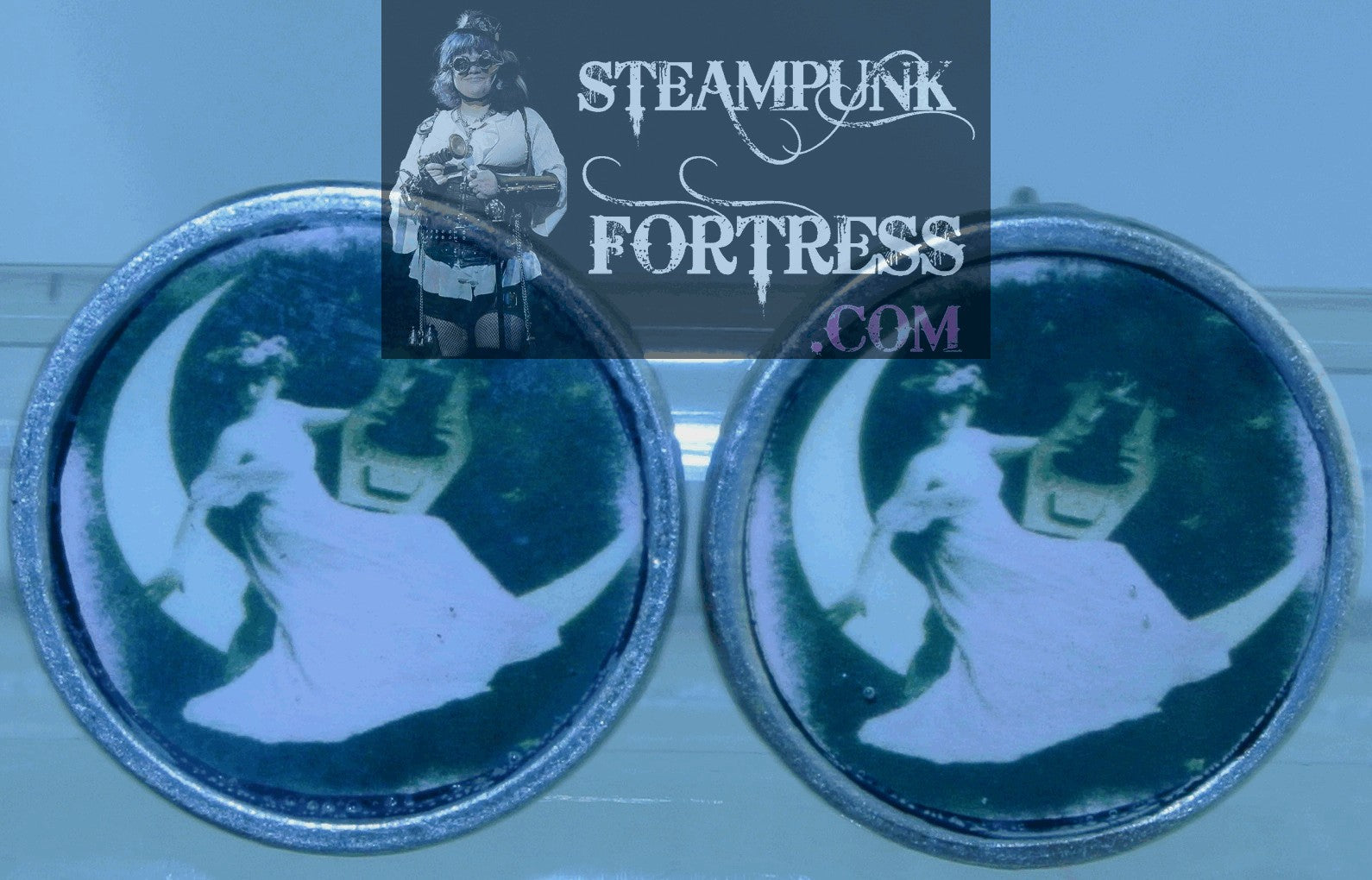 SILVER ROUND .75" VINTAGE LADIES LADY IN MOON IN PINK DRESS LYRE PIERCED EARRINGS SET AVAILABLE STARR WILDE STEAMPUNK FORTRESS