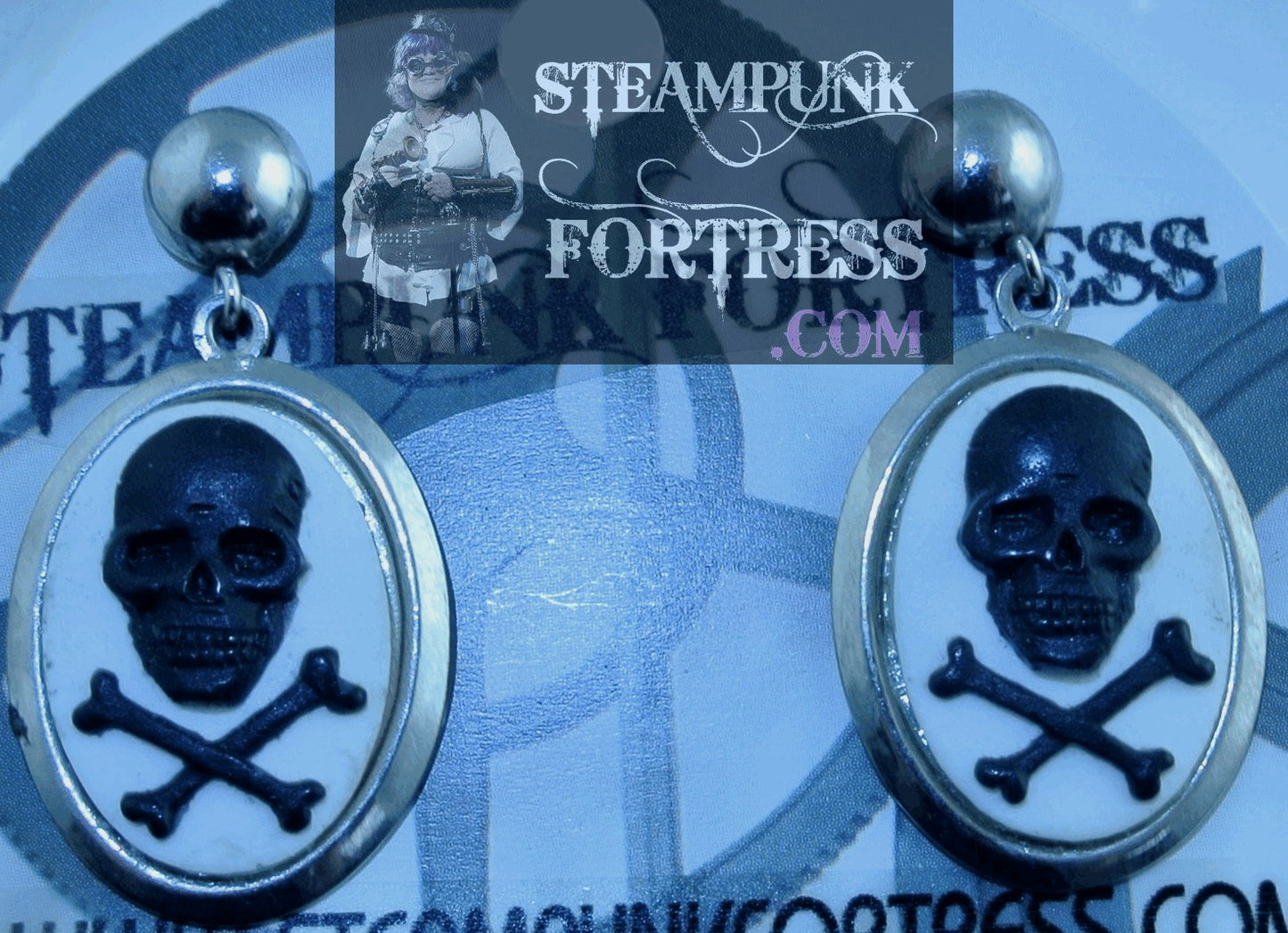 SILVER SKULLS CROSSBONES BLACK SKULLS ON WHITE CAMEO STUDS PIRATE HALLOWEEN PIERCED EARRINGS STARR WILDE STEAMPUNK FORTRESS