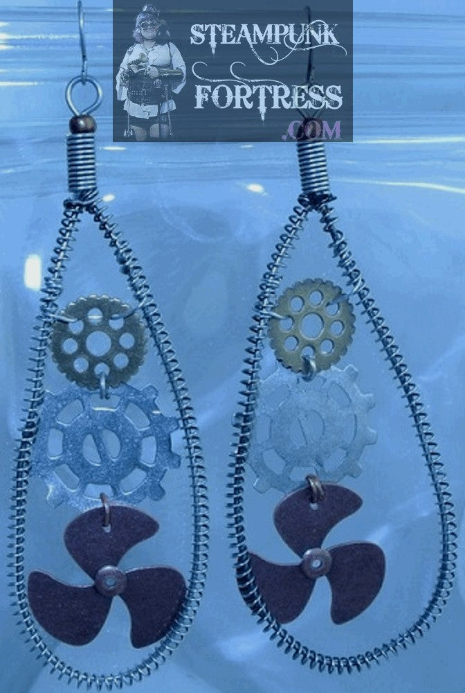 THIS IS A FABULOUS HANDMADE CUSTOM MADE STEAMPUNK DIESELPUNK CYBERPUNK, MEDIEVAL, RENAISSANCE, VICTORIAN, RENAISSANCE, EDWARDIAN, COSPLAY, COSTUME, SDCC, COMIC CON…..PIERCED EARRINGS...SILVER WRAPPED FRAME WITH BRASS AND SILVER GEARS AND COPPER PROPELLER..#1045