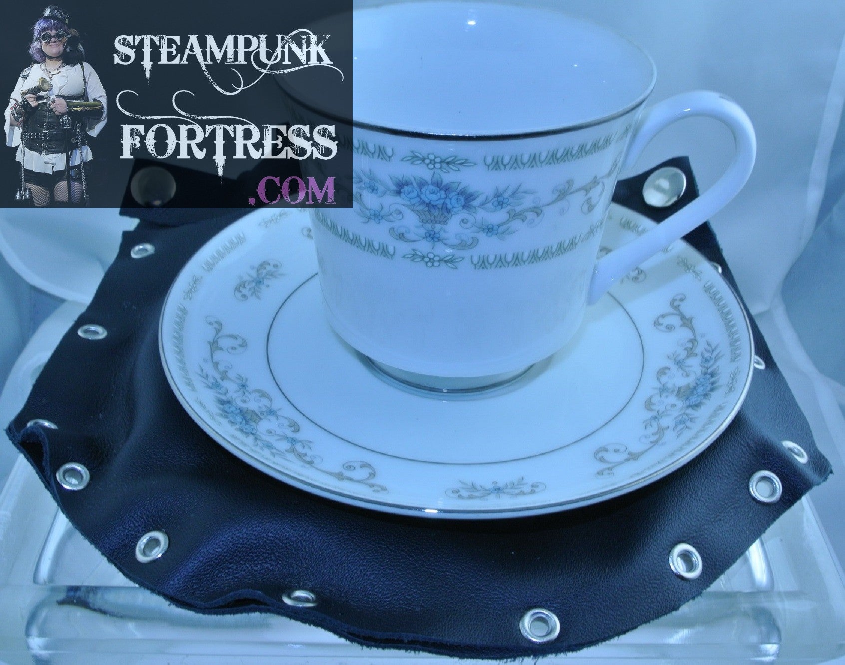 TEA CUP HOLDER BLACK LEATHER SILVER EYELET BLUE WHITE CHINA DUELING DUELLING CUP SAUCER STARR WILDE STEAMPUNK FORTRESS