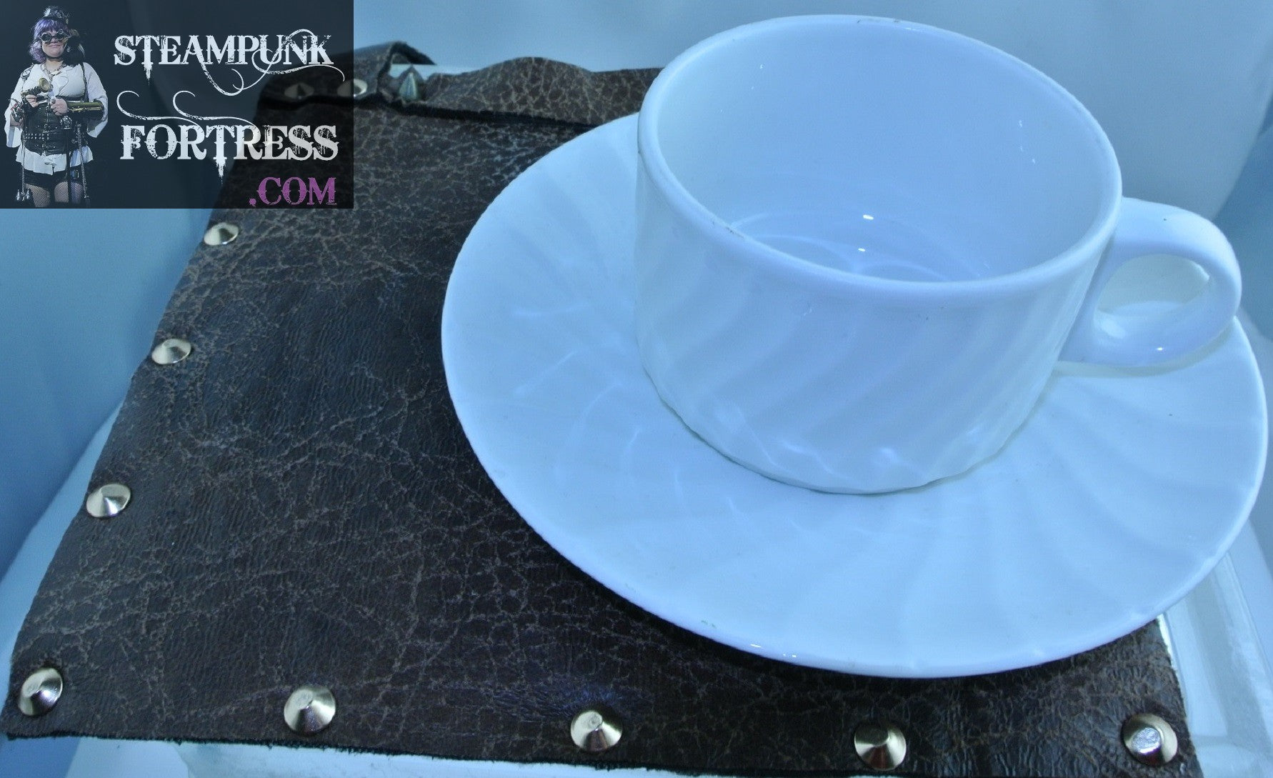 TEA CUP HOLDER FAUX LEATHER SUEDE VEGAN BUFF BROWN TEXAN WHITE SWIRL SET TEA DUELING DUELLING SAUCER STARR WILDE STEAMPUNK FORTRESS COSPLAY COSTUME
